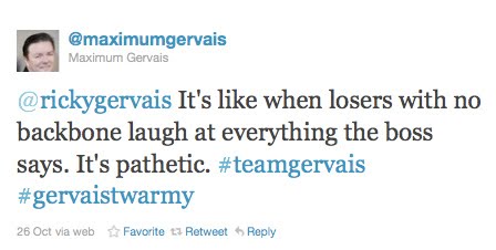 In fact it's exactly the sort of thing a Ricky Gervais superfan would tweet. Except that MaximumGervais replied saying: